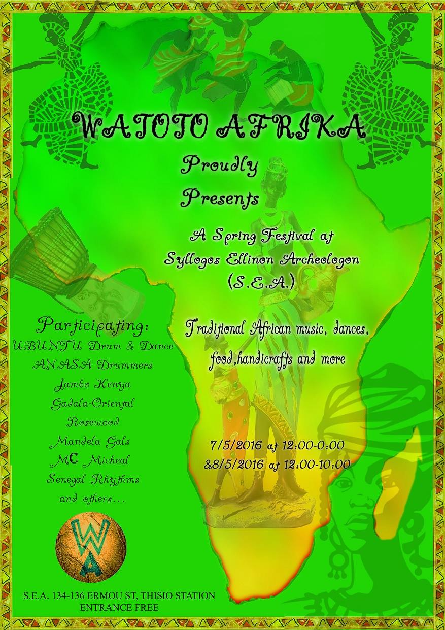 Τα εργαστήρια απευθύνονται τόσο στους μικρούς όσο και στους μεγάλους μας φίλους και περιλαμβάνουν μαθήματα μουσικής (αφρικάνικων κρουστών και τραγουδιού), χορού (αφρικάνικοι χοροί από την Κένυα και την Νότια Αφρική), εργαστήρια φωνητικής, Pilates, Yoga, εργαστήρια ζωγραφικής, αφρικανικού κοσμήματος και κατασκευής αφρικανικής μάσκας.