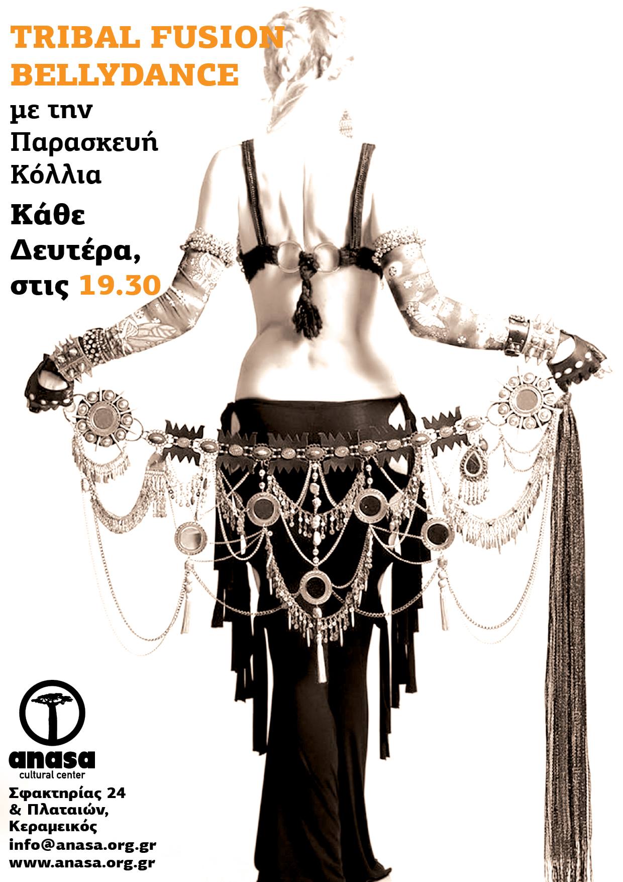 Το tribal fusion bellydance είναι ένας χορός που γνωρίζει τεράστια απήχηση σε όλο τον κόσμο, λόγω του χώρου που προσφέρει για εξερεύνηση διαφόρων ειδών χορού. Θεωρείται η σκοτεινή ή πανκ πλευρά του bellydance. Γεννήθηκε περί το 1970 στις ΗΠΑ και αναμιγνύει χορούς της Ανατολής (Βόρεια Αφρική, Μέση Ανατολή, Ινδία, Βαλκάνια) με πιο μοντέρνα είδη, όπως σύγχρονο, hip hop, φλαμένκο, ακόμα και burlesque, vaudeville και steampunk. Είναι ένα πάντρεμα παλιών και νέων κινήσεων, θεμελιωμένων σε αρχετυπικές εικόνων, και εκφρασμένων με σύγχρονα μέσα. Ανάλογα ποικίλλει και η μουσική, η οποία μπορεί να είναι από φολκλορική έως ηλεκτρονική, ρεμπέτικη, ακόμα και παραδοσιακή ελληνική. Τα κοστούμια είναι επίσης εμπνευσμένα από κουλτούρες όλου του κόσμου. Ένα χαρακτηριστικό αυτού του είδους χορού είναι η αντίθεση ‘φιδίσιων’ και απαλών κινήσεων με τις γεμάτες ένταση απομονώσεις διαφόρων μελών του σώματος. Βασίζεται σε μυϊκές κινήσεις, σε αντίθεση με το πιο ‘σκελετικό’ κλασσικό bellydance. Η φιλοσοφία του χορού είναι η αλληλεγγύη των χορευτών, η ενθάρρυνση και η χαρά που βιώνεται μέσα από τις κοινές εμπερίες, σε αντίθεση με την ανταγωνιστικότητα που καλλιεργείται στην κοινωνία μας. Ο χορός αυτός καλλιεργεί δύναμη, ευελιξία και συντονισμό του σώματος και παρουσιάζει ένα κομψό και μυστηριώδες αποτέλεσμα. Ξυπνά το κέντρο του σώματος, βελτιώνει την αυτοπεποίθηση και το δυναμισμό, καθώς και την επίγνωση του σώματος και την ισορροπία, και επιτρέπει στο χορευτή να ανταποκρίνεται στη μουσική με τις κατάλληλες κινήσεις, ρυθμικές και ακριβείς ή κυκλικές και αέρινες.