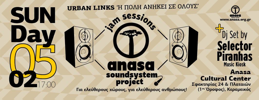 Το Anasa Soundsystem Open Jam Session Project, σας προσκαλεί στη Μουσική Συνάντηση ‘Urban Links – Η πόλη ανήκει σε όλους’ την Κυριακή 5 Φλεβάρη, στις 17:00, αυτή τη φορά στο δικό μας χώρο, το Πολιτιστικό Κέντρο Αφρικανικής Τέχνης & Πολιτισμού ANASA που βρίσκεται Σφακτηρίας 24 & Πλαταιών στον Κεραμεικό.