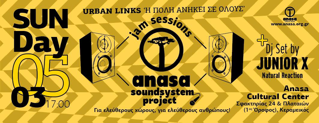 Tο Anasa Soundsystem Open Jam Session Project, σας προσκαλεί στη Μουσική Συνάντηση ‘Urban Links – Η πόλη ανήκει σε όλους’ την Κυριακή 5 Μάρτη, στις 17:00, στο δικό μας χώρο για άλλη μια φορά, το Πολιτιστικό Κέντρο Αφρικανικής Τέχνης & Πολιτισμού ANASA που βρίσκεται Σφακτηρίας 24 & Πλαταιών στον Κεραμεικό.