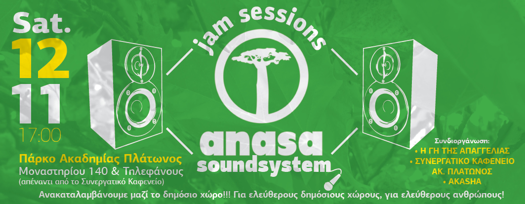Το Anasa Soundsystem Open Jam Session δημιουργεί αυτές τις εκδηλώσεις με στόχο να συνεχίσει την προσπάθεια του να ανακαταλάβει το δημόσιο χώρο & όχι μόνο, αλλά και να δημιουργήσει μια μετακινούμενη εστία δημιουργικής έκφρασης, ανταλλαγής ιδεών, αλλά και έναν χώρο συνάντησης όπου μουσικοί, ποιητές, ποιητές του δρόμου, χορευτές, εικαστικοί, εραστές της τέχνης, ταξιδευτές και θαμώνες της πόλης συνδημιουργούν επί τόπου.