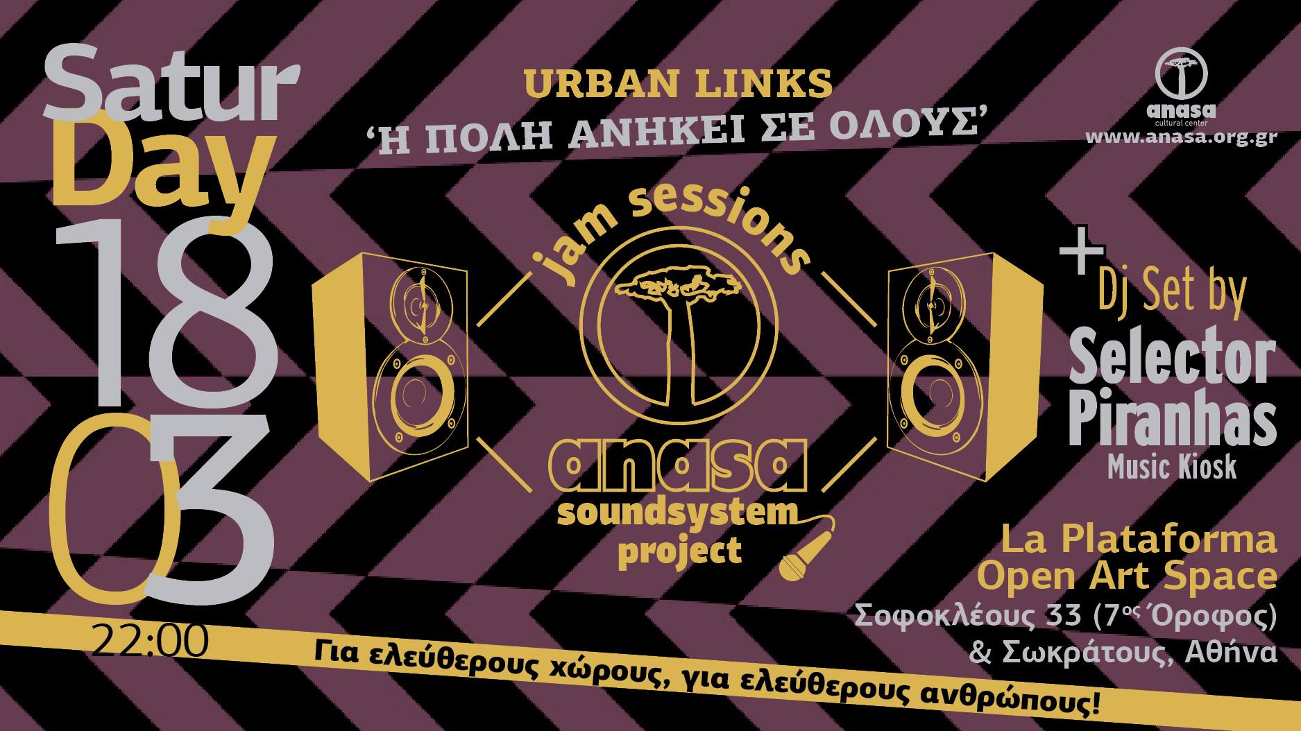 Το Anasa Soundsystem – Open Jam Session Project, σας προσκαλεί στο Party ‘Urban Links – Η πόλη ανήκει σε όλους’ το Σάββατο 18 Μάρτη, στις 22:00, στον ελεύθερο πολυχώρο τέχνης & δημιουργίας La Plataforma, Σοφοκλέους 33 & Σωκράτους (στον 7ο Όροφο), στο κέντρο της Αθήνας. Μουσικοί αυτοσχεδιασμοί & dj set από τον Selector Piranhas (Music Kiosk) που θα μας συνοδεύει στους ρυθμούς της reggae και όχι μόνο.