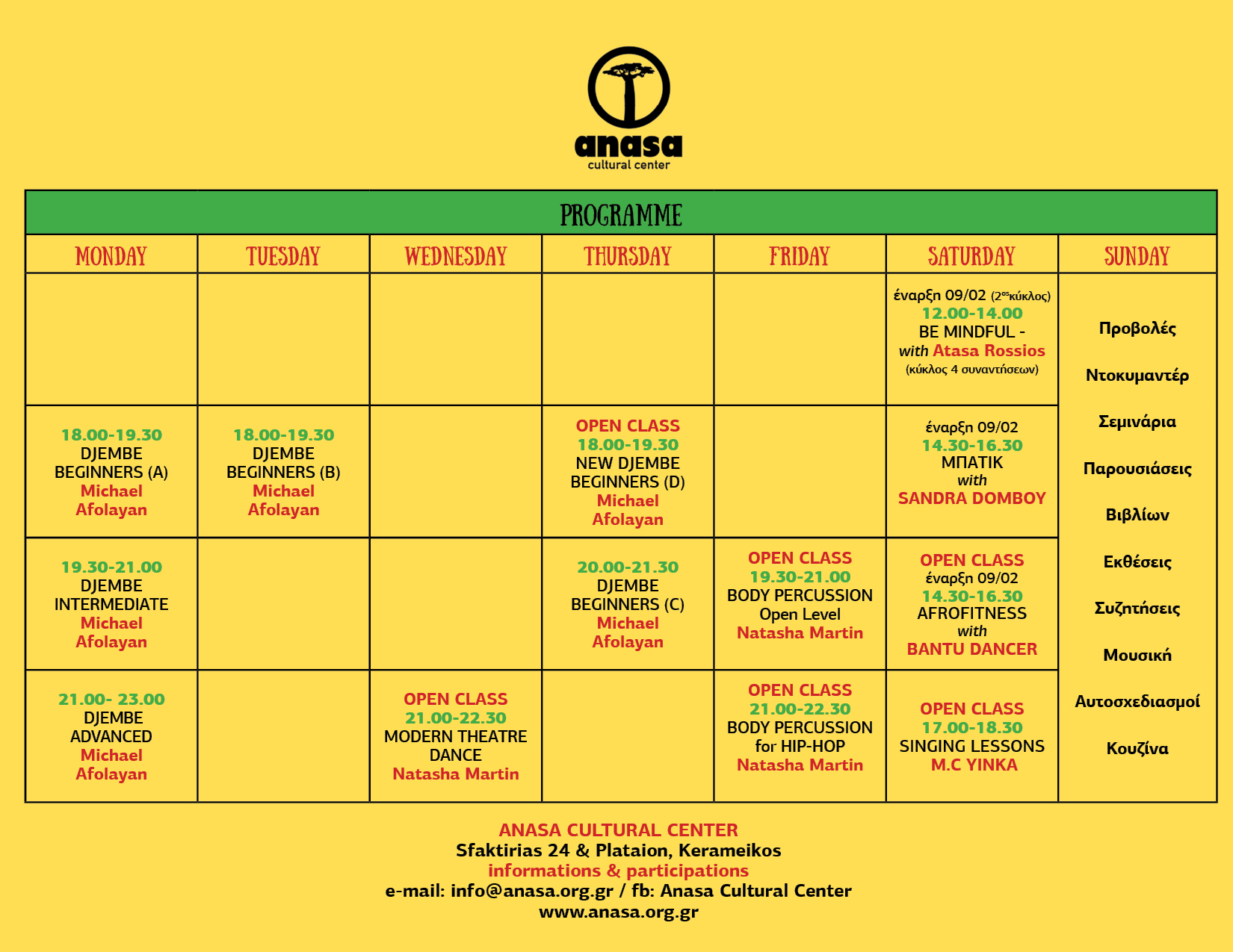 Από τις 6 Φεβρουαρίου έως τις 10 Φεβρουαρίου τα µαθήµατα του Αnasa Cultural Center θα είναι ΑΝΟΙΧΤΑ για όποιους ενδιαφέρονται να έρθουν σε µια πρώτη επαφή. OPEN CLASSES – 06/02 Τετάρτη 21.00-22.30 Modern theatre dance με τη Natasha Martin – 07/02 Πέμπτη18.00-19.30 NEW Djembe Beginners με τον Μichael Afolayan – […]