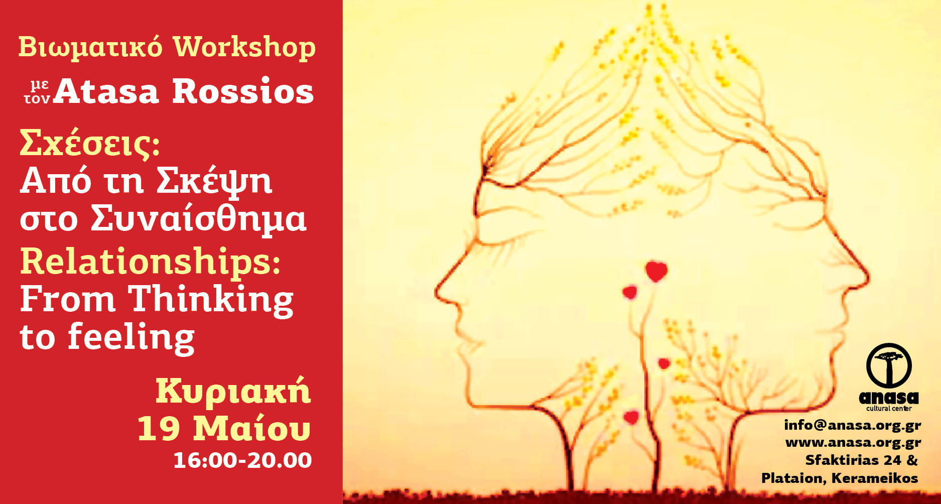Βιωματικό Workshop ΣΧΕΣΕΙΣ: Από τη Σκέψη στο Συναίσθημα Relationships: From Thinking to Feeling με τον Αtasa Rossios Κυριακή 19 Μαίου 16:00-20:00 στο Anasa Cultural Center, Σφακτηρίας 24 & Πλαταιών, Κεραμεικός Πληροφορίες & Συμμετοχές: info@anasa.org.gr *απαραίτητη η δήλωση συμμετοχής Σκέψη και συναίσθημα, δύο διαφορετικές διαστάσεις. Είμαστε πλέον τόσο διανοητικά προσανατολισμένοι […]